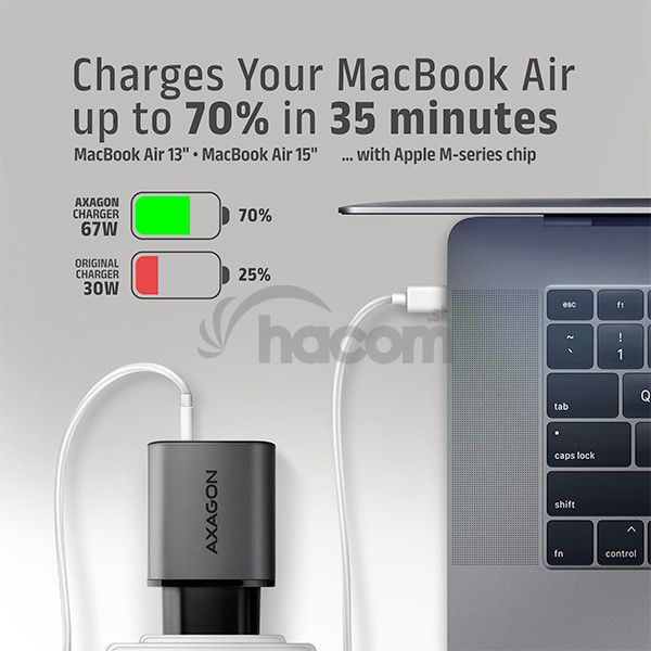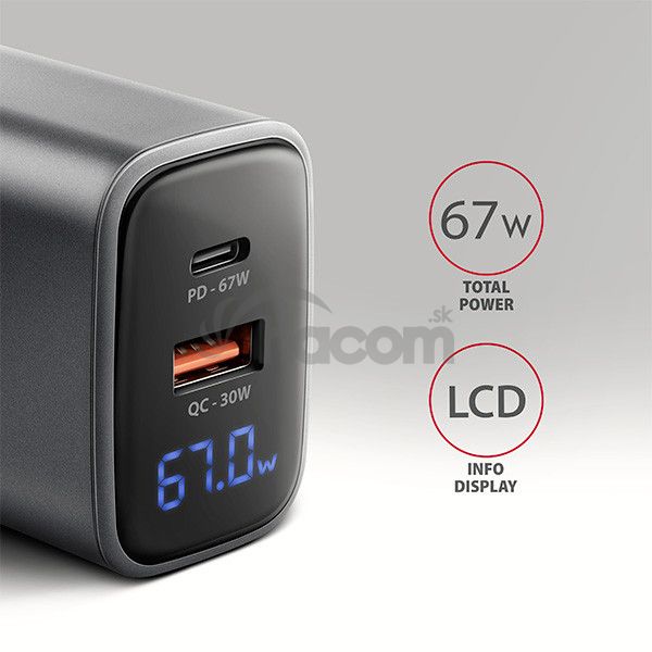 Cestovná nabíjačka do siete AXAGON ACU-PQ67D GaN umožňuje rýchle nabíjanie až dvoch mobilných zariadení súčasne . Vďaka celkovému výkonu 67W dokáže nabíjačka dobíjať notebooky, tablety, telefóny a ďalšie mobilné zariadenia najvyššou možnou rýchlosťou. Adaptér ponúka nielen štandardný USB-A konektor , ale aj oboustranný USB-C konektor . Prehľadný LCD displej zobrazuje aktuálne výkon nabíjania.Kompaktná veľkosť a vysoký výkon je daný využitím novej GaN technológie . Použité súčiastky s Nitridom Galia pracujú s vysokou účinnosťou, čo umožňuje dosahovať vysoké výkony pri malej veľkosti. Nabíjačka je vybavená výstupom Power Delivery 3.0/Quick Charge 4+ USB typu C a Quick Charge 3.0 USB typu A, vďaka čomu umožňuje rýchle nabíjanie nielen smartfónov a tabletov, ale aj notebookov.