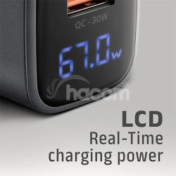 AXAGON ACU-PQ67D, GaN nabíjačka do siete 67W, výstup USB-A+USB-C, PD3.0/PPS/QC4+/SFC2.0/Apple, LCD ACU-PQ67D