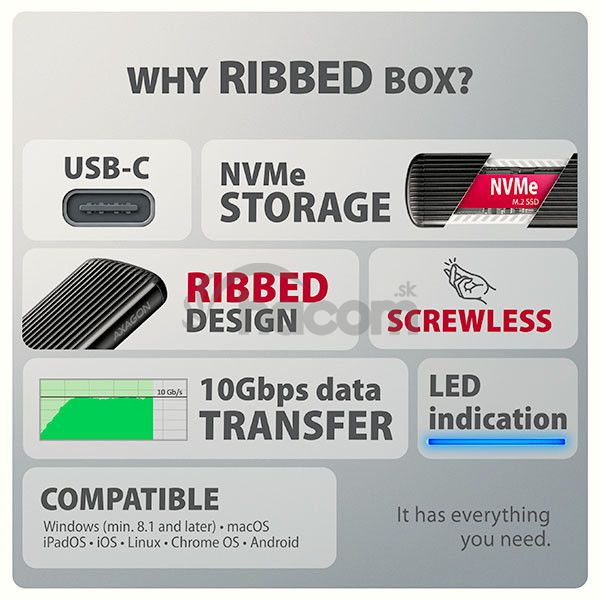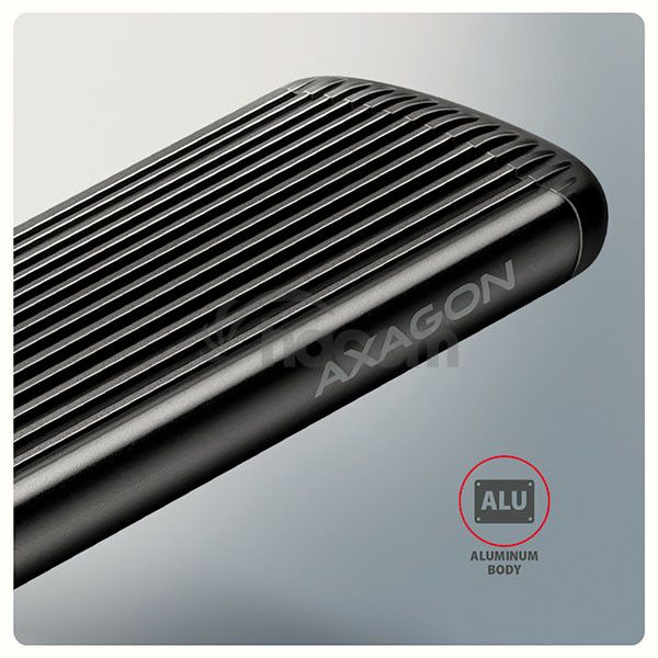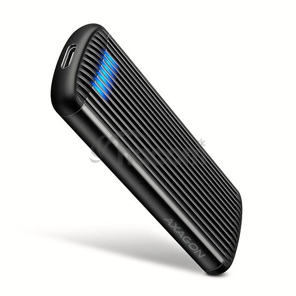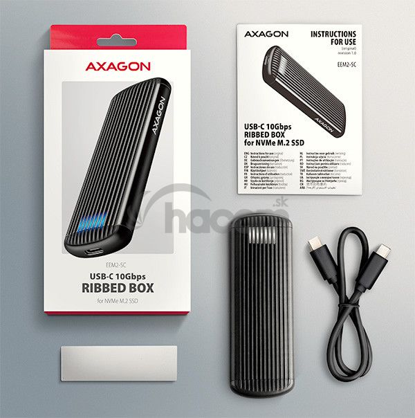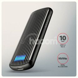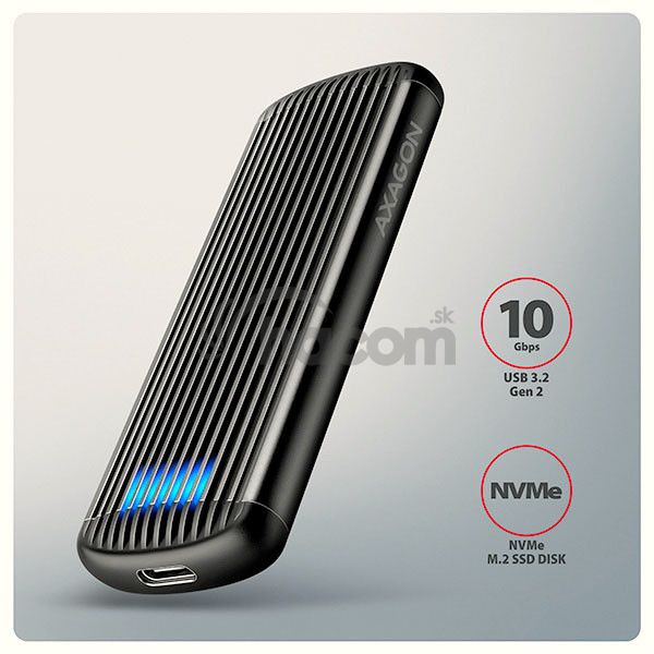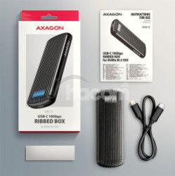 - AXAGON EEM2-SC, USB-C 10Gbps externý box pre M.2 NVMe SSD, bezskrutkový, rebrovaný hliník EEM2-SC