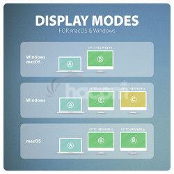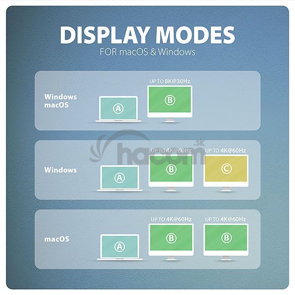 • Na dosiahnutie maximálnych hodnôt rozlíšenia a frekvencií na video výstupoch je nutné húb zapojiť do USB-C portu s podporou DisplayPort Alternate Mode (DP Alt Mode) verzie min. 1.4 alebo do USB-C portu s podporou min. Thunderbolt 3. Ďalej je nutný vhodný aktualizovaný OS a aktuálne grafické ovládače.