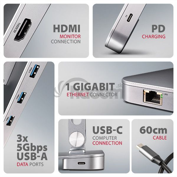 - AXAGON HMC-STND, stojan pre 10"-16" notebooky, USB 5Gbps húb, 3x USB-A, HDMI 4k/60Hz, RJ-45, PD 100W HMC-STND