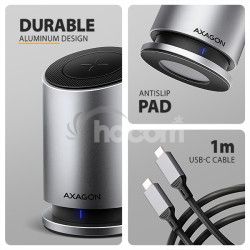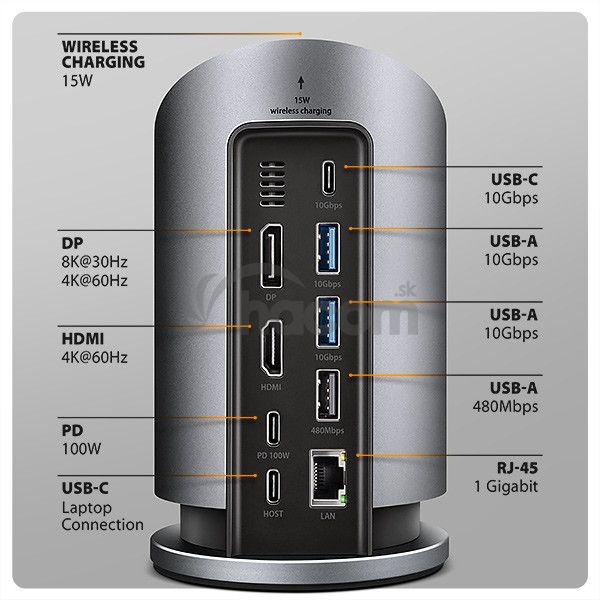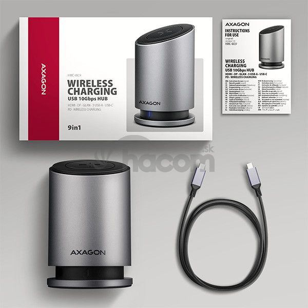 Multiportový USB-C 10Gbps AXAGON HMC-WL9 WIRELESS CHARGING 9in1 húb rozšíri váš notebook, počítač alebo telefón o dva video výstupy, LAN konektor, USB porty a bezdrátovú nabíjačku . Váš notebook pripojíte k hubu cez 60 cm dlhý USB-C kábel. Okamžite tak máte k dispozícii pripojenie pre dva 4K monitory, štyri USB zariadenia a konektor RJ-45 pre Gigabitovú Ethernet sieť . Zároveň získate možnosť napájania notebooku pomocou technológie Power Delivery . Vďaka kompatibilite s rozhraním Thunderbolt 3/4/5 môžete dokovaciu stanicu 9v1 použiť aj s notebookmi, ako sú napríklad Apple MacBook Air alebo MacBook Pro .Bezdrôtové nabíjanie pre mobilné telefóny s výkonom až 15 W je integrované priamo do tela hubu . Vďaka magnetickému systému uchytenia stačí telefón jednoducho priložiť - automaticky sa vyrovná do optimálnej pozície. Nabíjanie je tak maximálne efektívne, bezpečné a pohodlné. Samozrejmosťou je kompatibilita so štandardmi Qi1, Qi2 a MagSafe . Na dosiahnutie maximálneho výkonu bezdrôtového nabíjania je nutné použiť 100W PD nabíjací adaptér.