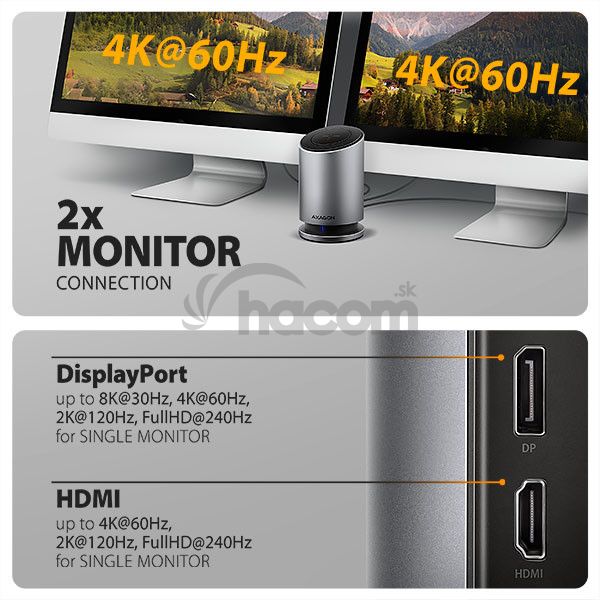 • 2 monitory (DP + HDMI) – až 4K/60Hz Ultra HD, 2K/120Hz Quad HD, 1080p/240Hz Full HD.