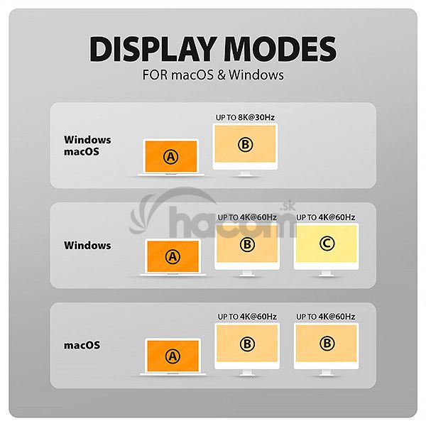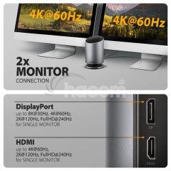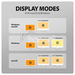 • Na dosiahnutie maximálnych hodnôt rozlíšenia a frekvencií na video výstupoch je nutné húb zapojiť do USB-C portu s podporou DisplayPort Alternate Mode (DP Alt Mode) verzie min. 1.4 alebo do USB-C portu s podporou min. Thunderbolt 3. Ďalej je nutný vhodný aktualizovaný OS a aktuálne grafické ovládače.