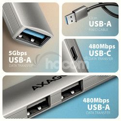 AXAGON HUE-STA, 4x USB ALU STRIP húb, 1x USB-A 5Gbps, 2x USB-A & 1x USB-C 480Mbps, kábel USB-A 12cm HUE-STA