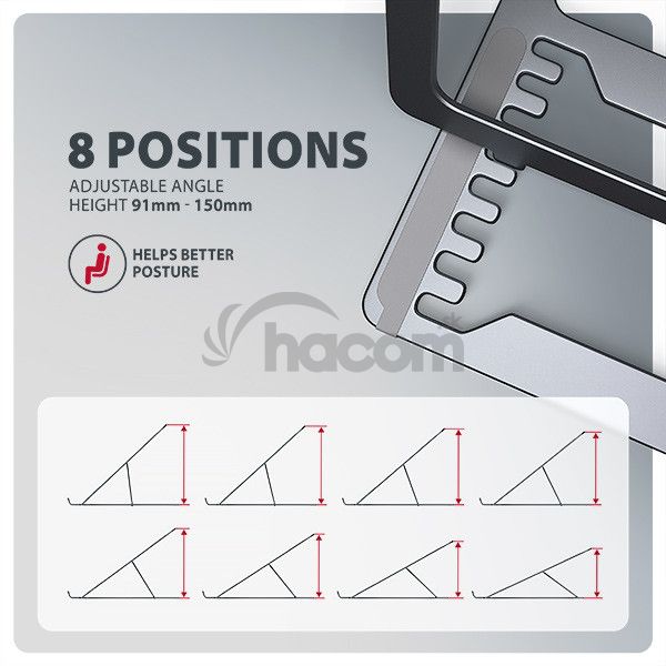 Veľkou výhodou je možnosť nastavenia až ôsmich poloh. Vďaka tomu môžete notebook zdvihnúť do výšky od 91 do 150 mm . Tím získate ďalšiu pracovnú plochu v správnej úrovni očí, čo výrazne zlepšuje ergonomiu a pohodlie pri práci, a zároveň zvyšuje vašu produktivitu.