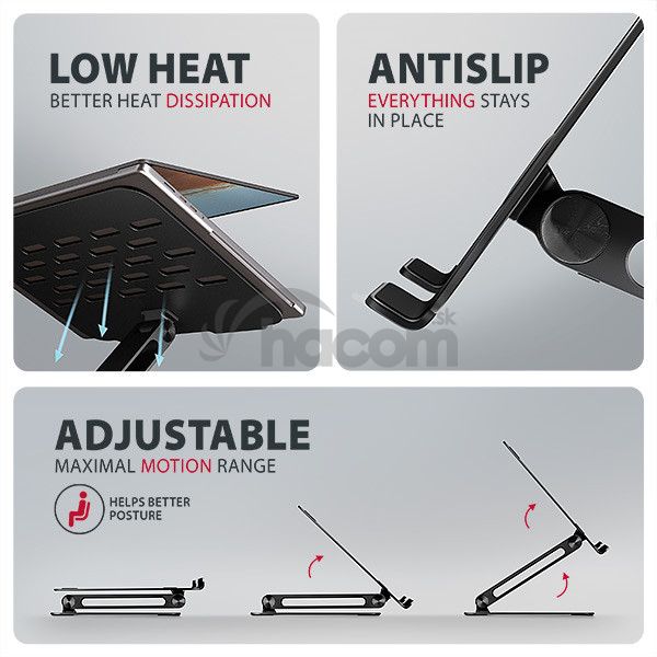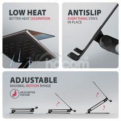 Výrezy v podstavci zaisťujú optimálny odvod tepla z vášho notebooku, čím zvyšujú jeho výkon a životnosť. Vďaka premyslenej konštrukcii môžete ľahko upraviť uhol náklonu , a to aj s práve používaným zariadením, pre maximálne pohodlie a efektivitu pri práci.