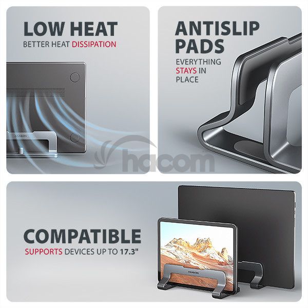 Vertikálny stojan poskytuje notebooku viac priestoru okolo ventilátorov , čo zaisťuje účinnejší odvod tepla a pomáha udržať stabilný výkon aj dlhšiu životnosť zariadenia. Zároveň udržuje klávesnicu čistejšiu a chráni notebook pred prachom aj náhodným poliatím, pretože je zdvihnutý nad pracovnú plochu.