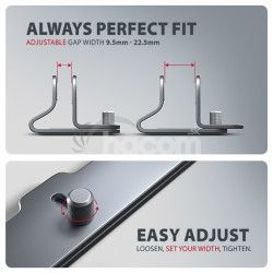 AXAGON STND-VG je elegantný a praktický stojan na notebook či tablet , ktorý umožňuje vertikálne vloženie zariadenia a vnáša do pracovného priestoru pořádok a viac voľného miesta . Hodí sa pre zariadenia s uhlopriečkou od 10" do 17.3" . Kompaktné a ľahko prenosné prevedenie zaisťuje pohodlné použitie doma, v kancelárii aj na cestách.Výhodou je nastaviteľné rozpätie stojana od 9.5 mm do 25.5 mm , vďaka ktorému do neho ľahko vložíte väčšinu notebookov. Nastavenú šírku spolehlivo udrží brúsený regulačný skrutka , ktorá pevne zafixuje požadovanú polohu.