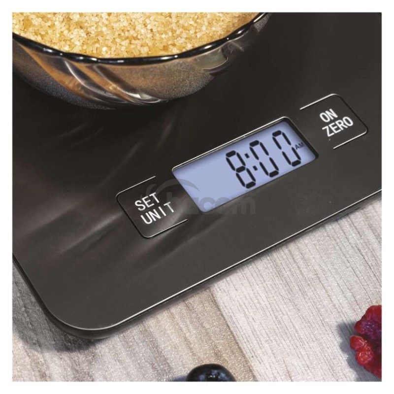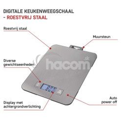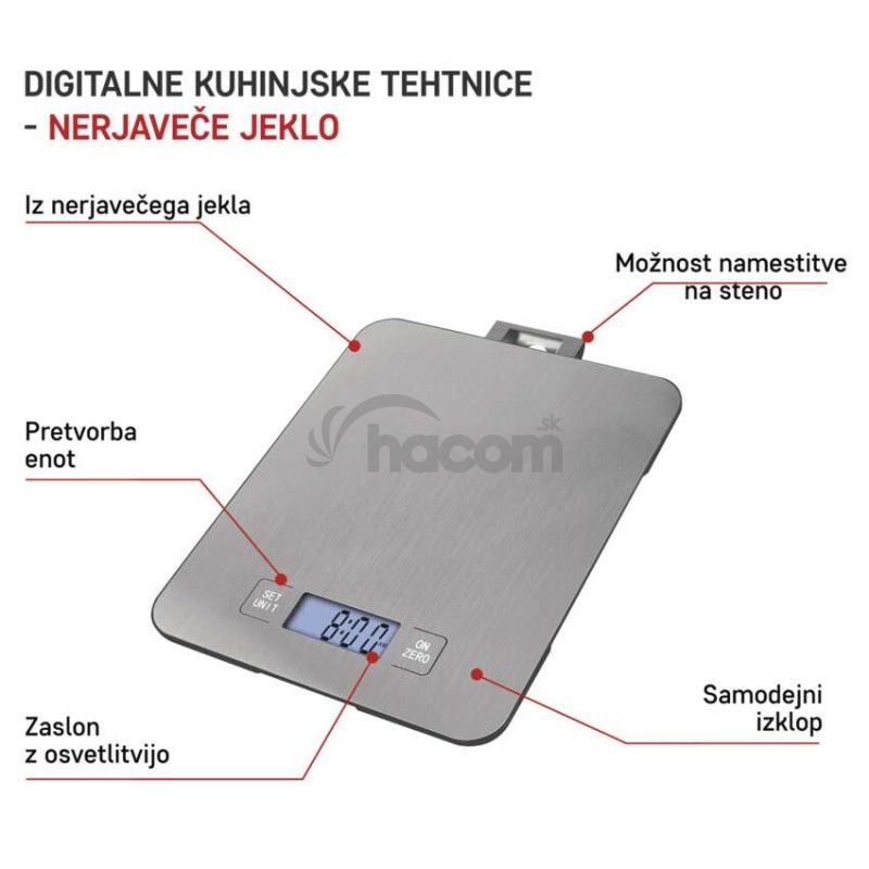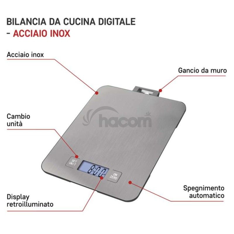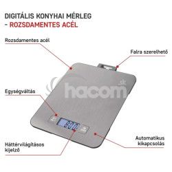 pohotová váha, dá sa zavesiť niekde v kuchyni, vode odolná, po pridaní napr.hrnčeka sa vynuluje, takže meria iba následný obsah v ňom, dobrý, jednoduchý dizajn, podľa výrobcu váži 15kg (neodskúšané)