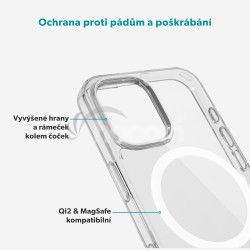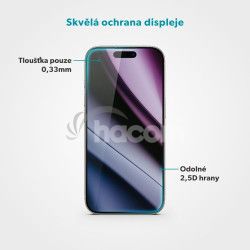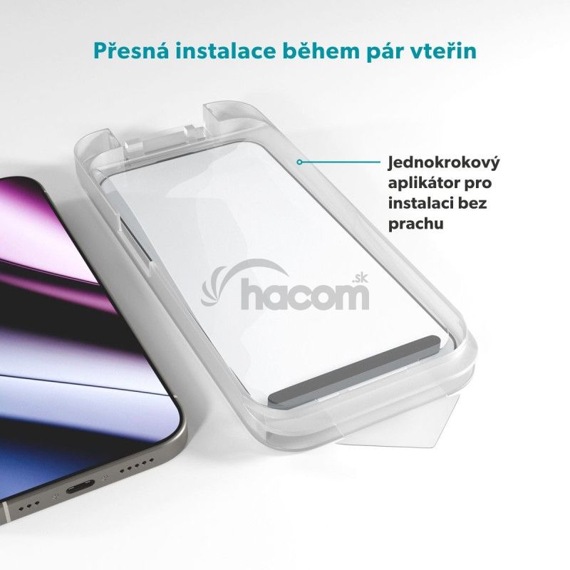 Priehľadná zadná strana krytu s UV ochranou zabraňuje zožltnutiu a zachováva pôvodný vzhľad iPhonu. Ochranné sklo kryje displej od kraja k kraju as hrúbkou 0,33 mm v kombinácii s tvrdosťou 9H ho spolehlivo chráni bez toho, aby znižovalo citlivosť dotyku alebo ostrosť obrazu. Špeciálna vrstva proti odtlačkom prstov zároveň udržuje povrch displeja čistý a bez šmúh. Štíhle prevedenie krytu a hladké 2,5D hrany skla zaručujú, že váš iPhone působí elegantne a príjemne padne do ruky. Pružný rámček krytu a jednokrokový aplikátor skla uľahčujú inštaláciu, takže všetko zvládnete rýchlo a ľahko.