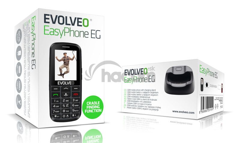 EVOLVEO EasyPhone EG je ľahko ovládateľný elegantný tlačidlový telefón. V čiernom prevedení je telefón dodávaný s odolným kovovým predným panelom. Jednotlivé tlačidlá klávesnice sú oddelené, čo uľahčí písanie SMS správ a zadávanie telefónnych čísiel. Múdra nabíjacia kolíska umožní po stlačení tlačidla aktivovať zvonenie na telefóne. Vďaka tejto funkcii tak odložený telefón ľahko nájdete.