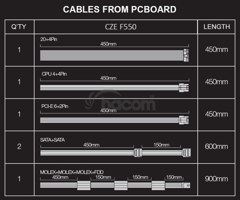 • Ventilátor 14cm, zelený • Aktívne PFC • Certifikácia 80+ • Účinnosť minimálne 82% / 85% / 82% pri zaťažení 20% / 50% / 100% • Ochrana proti skratu, preťaženiu, prepätiu a podpätiu • kabeláž: • 1x MB 20 + 4pin 450 mm • 1x cpu 4pin (8pin - 4 + 4) 450 mm • 1x VGA PCI-E 6 + 2pin 450 mm • 1x MOLEX, 450mm + MOLEX 150mm + MOLEX 150 mm + FDD 150 mm • 2x kábel S-ATA 450mm + S-ATA150mm • čierna farba MIL-STD-810G: 2008