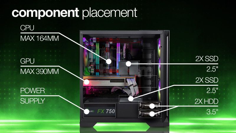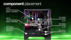 Vnútorný priestor tejto hernej počítačovej skrine je navrhnutý tak veľkoryso, že môže byť základom aj pre tie najambicióznejšie počítačové zostavy. Chladič procesora môže merať až 164 mm na výšku. Grafická karta sa sem zmestí v dĺžke až 390 mm . A pre ukladanie dát je k dispozícii miesto pre 2 klasické pevné disky (3,5") a 3 moderné rýchle SSD úložiská (2,5"). Každá hardvérová súčiastka je skrátka v tejto digitálnej pevnosti vítaným hosťom a dostane sa jej starostlivosť ako na cisárskom dvore. Úlohu pritom nehrá ani jej urodzený pôvod – do skrine sa dajú vložiť základné dosky Intel aj AMD , pričom sú podporované formáty ATX, eATX (Extended ATX), mATX (Micro ATX) aj mITX (mini ITX).