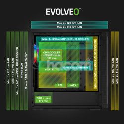 V počítačovej skrini EVOLVEO Scorpio-BK-4 je dostatok miesta na všetko, čo má nadupaná herná mašina mať. Zmestí sa sem až 415mm grafická karta, chladič procesora s výškou až 180 mm aj všetky potrebné disky – v skrini sú 4 pozície pre 3,5" HDD a 5 slotov pre 2,5" SSD . Nič vám tak nebráni zostaviť si počítač, ktorého hardvér hrá prvú ligu.