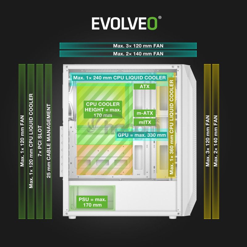 Na prvú dobrú by ste možno povedali, že počítačová skriňa s rozmermi 204 × 420 × 355 mm a hmotnosťou 4,5 kg nemôže ponúkať nič extra. Lenže to by nesmela byť reč o EVOLVEO Xenon-WH-4 – počítačovej skrini, pri ktorej je prijateľná veľkosť v dokonalej rovnováhe s veľkorysosťou vnútorného priestoru . Jej zásluhou sa vám stolný počítač bez problémov vojde na stôl aj do skromného herného kútika, avšak dovnútra skrine sa vedia všetko, čo si vaše neskromné herné ambície žiadajú.