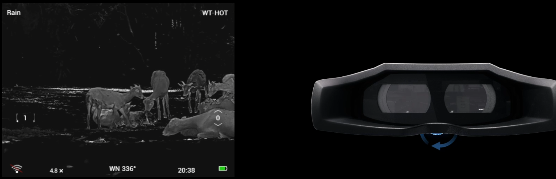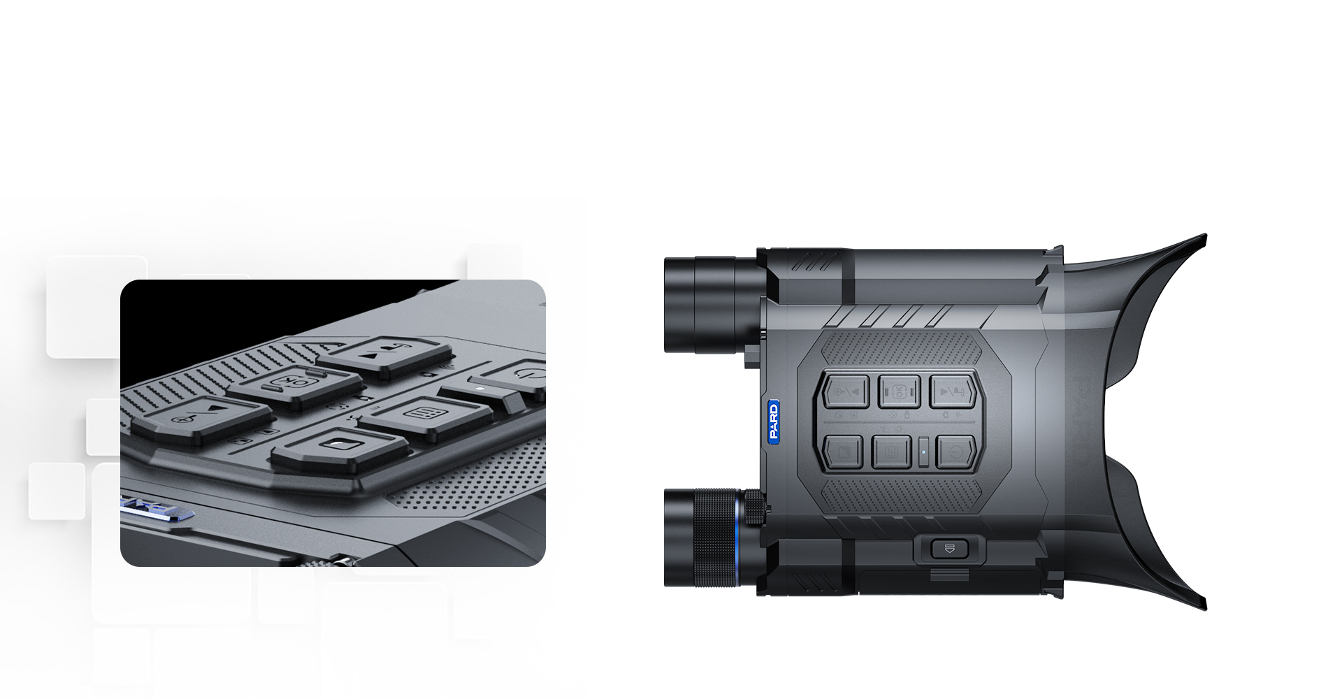 Binokulárna konštrukcia ponúka nastaviteľnú interpupilárnu vzdialenosť pre maximálny komfort pozorovania a ergonomické použitie. Funkcie ako obraz v obraze (PIP), gyroskop, elektronický kompas, nahrávanie fotografií a videa alebo vstavaný mikrofón posúvajú možnosti zariadenia ešte ďalej.