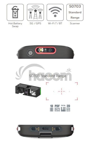 - Honeywell CT70: WIFI7/6E, 8GB/128GB, Štandard Range Engine-Red Laser, Extended Battery, GMS CT70-L0N-057CE104G