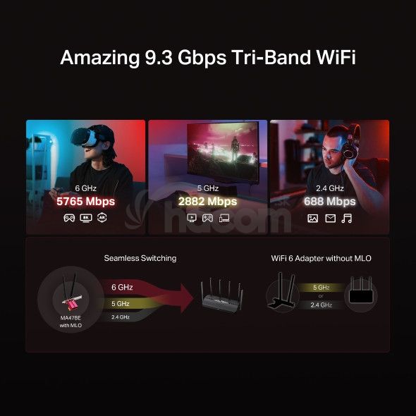 Zvýšte svoje celkové rýchlosti až na 5765 Mb/s (6 GHz) + 2882 Mb/s (5 GHz) + 688 Mb/s (2,4 GHz).