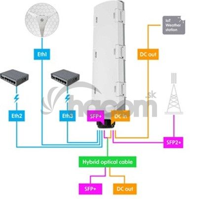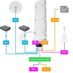 Riešenie pre náročné vonkajšie inštalácie, kde je potrebné rozdeliť dáta a napájanie z jedného hybridného kábla na viacero zariadení. Switch GPERx6 kombinuje 3 Gigabit Ethernet porty s PoE funkcionalitou, 3 vysokorýchlostné 10G SFP+ porty pre optické spoje a 3 DC výstupy pre napájanie IoT zariadení alebo špecializovaných prístrojov.