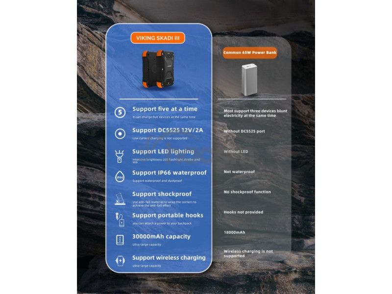 Outdoorová powerbanka Viking SKADI IIIMilujete dobrodružstvo v prírode, ale máte obavy, že vám batérie v zariadeniach dôjdu, keď ich budete najviac potrebovať? S našou outdoorovou powerbankou Viking SKADI III sa už nemusíte ničoho obávať. Táto vysoko odolná a výkonná powerbanka s kapacitou 30000 mAh/111Wh bola navrhnutá tak, aby vydržala extrémne podmienky a poskytla vám energiu, keď ju najviac potrebujete.