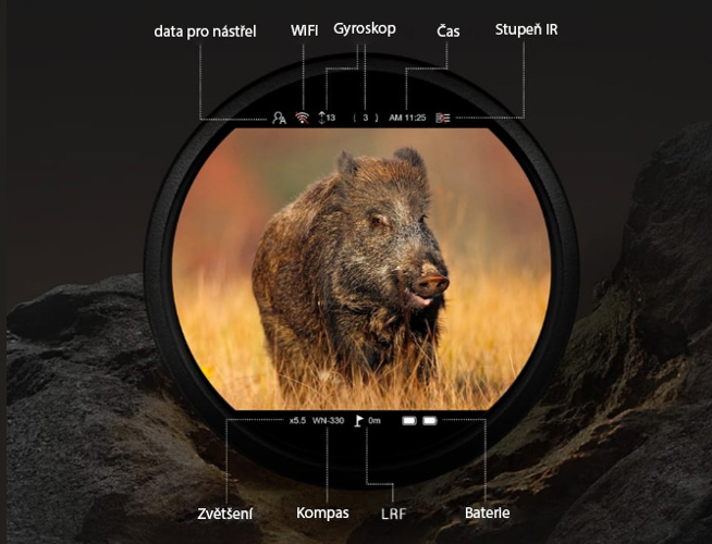 PARD Night Stalker 4K eX poskytuje prehľad všetkých kľúčových informácií priamo v zornom poli. Okrem základných údajov, ako je čas, stav batérie a úroveň IR prísvitu, zobrazuje aj pokročilé funkcie - dáta pre nástrel, kompas, gyroskop a laserový diaľkomer (LRF). Vďaka tomu má používateľ v každom okamihu k dispozícii presné informácie potrebné pre rýchle a spoľahlivé rozhodnutie.