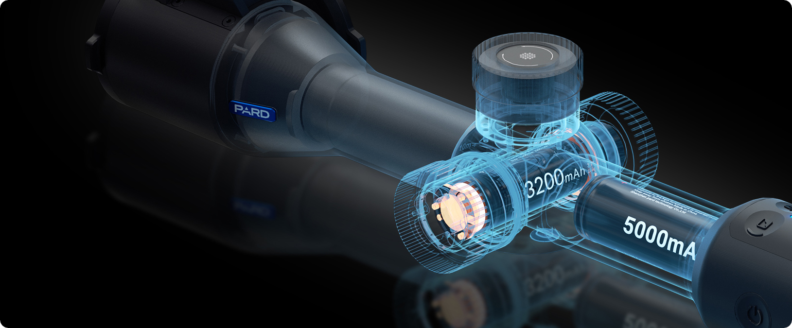 PARD Night Stalker 4K eX využíva kombináciu vstavanej batérie typu 21700 a jednej vymeniteľnej 18650. Tento systém zaisťuje stabilný výkon a až 14 hodín nepretržitej prevádzky. Užívateľ tak získava istotu, že prístroj obstojí aj pri dlhšom nasadení bez nutnosti častého dobíjania.