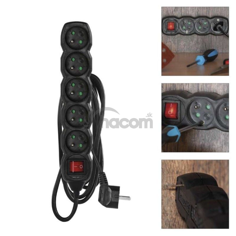 - Predlžovací kábel 3 m / 5 zásuviek / s vypínačom / čierny / PVC / 1,5 mm2 PC1513R