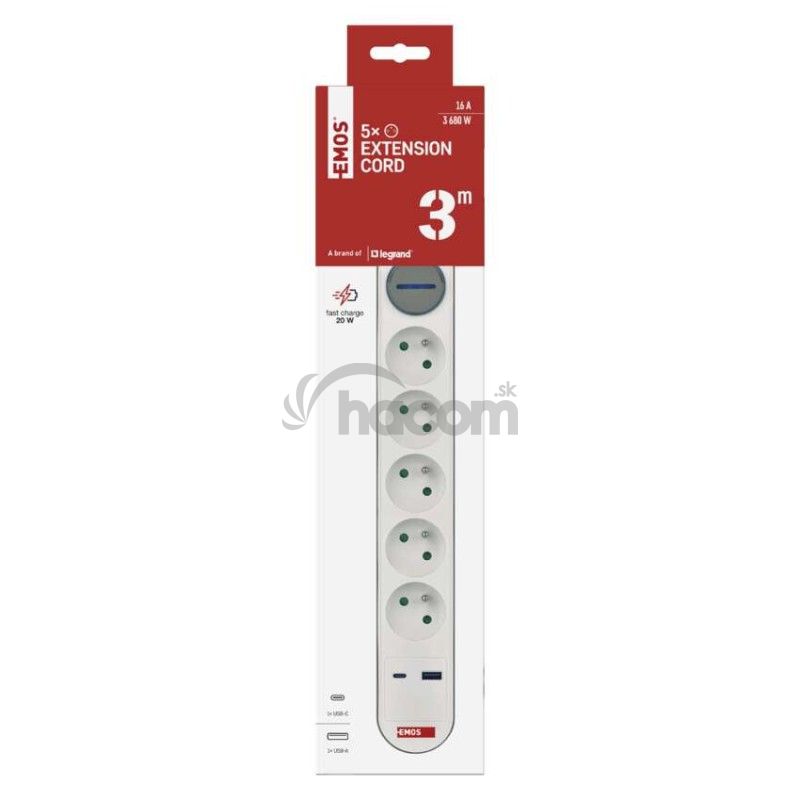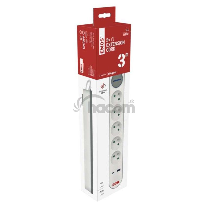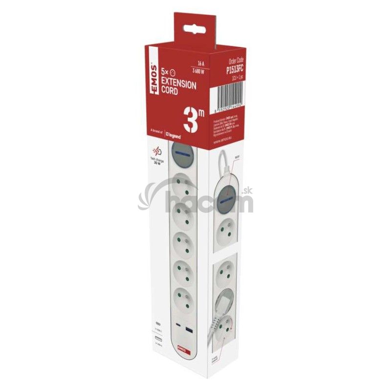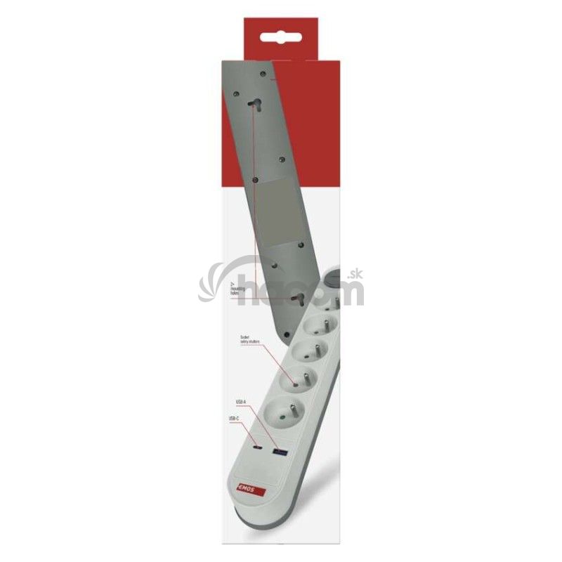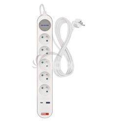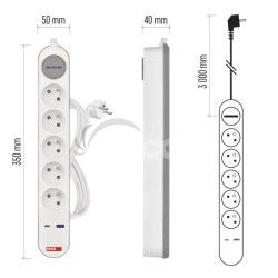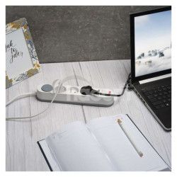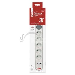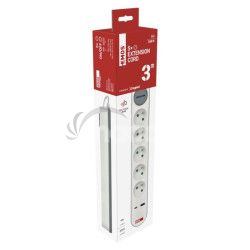 - Predlžovací kábel 3 m / 5 zásuvky / s vypínačom / bielo-sivý / 1×USB-A + 1×USB-C / 1,5 mm2 P1513FC
