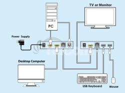 * Extender prenáša tiež USB, vysielač má jeden USB pre zapojenie do počítača, prijímač má dva USB konektory pre zapojenie napríklad myši a klávesnice