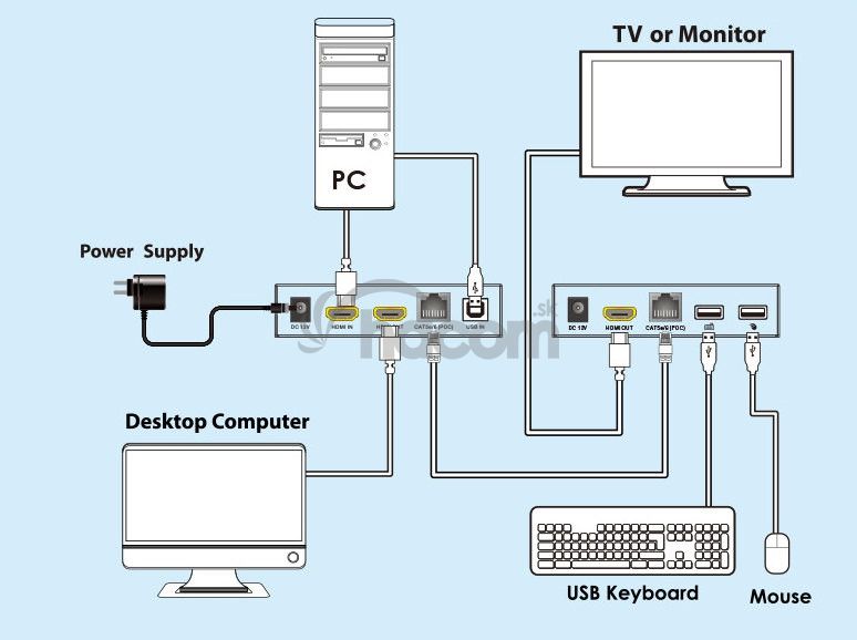 * Vysielač má jeden vstupný HDMI konektor a jeden lokálny HDMI výstup. Prijímač má jeden HDMI výstup pre vzdialená monitor.