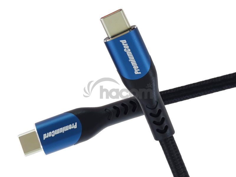 PremiumCord USB-C kábel (USB 3.2 GEN 2x2, 5A, 100W, 20Gbit/s) hliníkové krytky konektorov, bavlnený oplet, 0,5m- Prvý konektor: USB 3.2 typ C samec