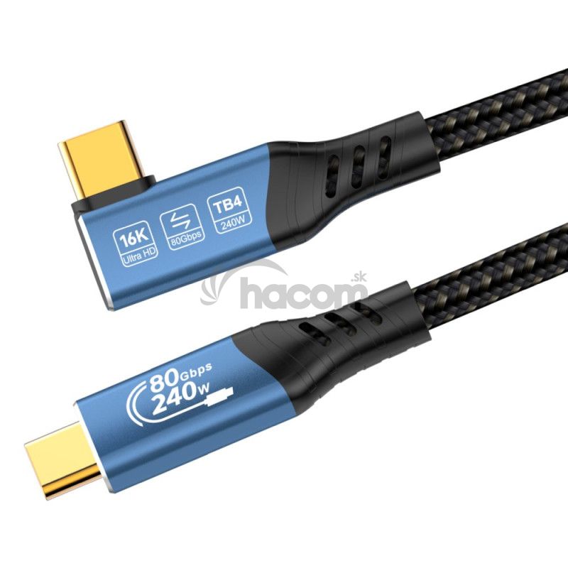 PremiumCord USB4™ Version2.0 80Gbps 16K@60Hz 240W Thunderbolt 3 a 4 kábel zahnutý 90° dĺžka 1,5mTento kábel USB4™ Version2.0 ponúka extrémne vysokú prenosovú rýchlosť až 80 Gbit/s, takže je ideálny pre dátovo náročné aplikácie. Preneste videa vo vysokom rozlišení až 16K na monitory a televízory, vychutnajte si ostrý obraz a vynikajúci zvuk. Umožňuje napájať alebo nabíjať až do výkonu 240W.