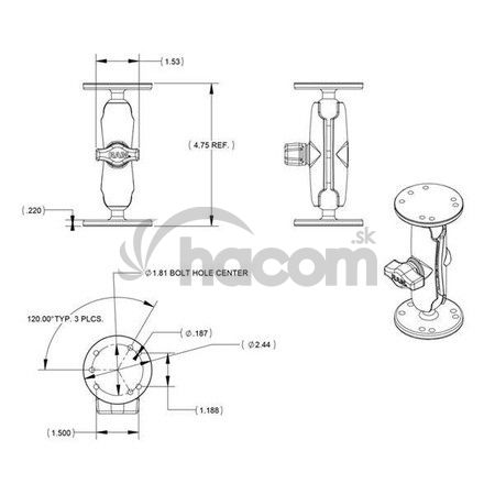 - RAM zostava - stredné rameno s dvoma okrouhlými základňami 2,5" a guľovým kĺbom 1" RAM-B-101U