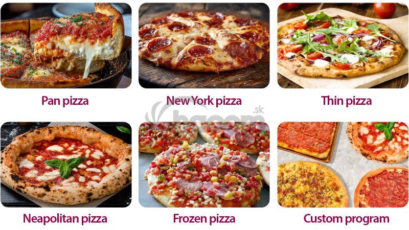 • New York pizza: Väčšie, mäkkšie plátky s pružným cestom, ktoré sa dá ľahko zložiť napoly. Program kombinuje stredne vysokú teplotu a dlhšie pečenie, vďaka čomu vznikne zlatistý, ale stále vláčný základ – ideálny pre surové a výrazné americké pizze.