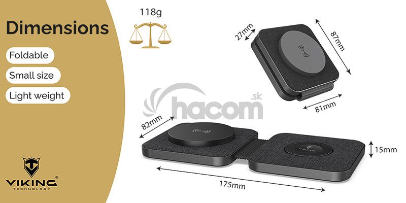 Skladacia wireless nabíjačka Viking WN21 sa vďaka svojmu skladaciemu mechanizmu vyznačuje mimoriadnou kompaktnosťou a jednoduchou prenositeľnosťou. V zloženom stave má rozmery iba 27 mm na výšku, 87 mm na dĺžku a 81 mm na šírku, a pri rozložení je dlhá 175 mm.