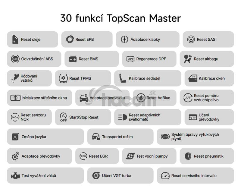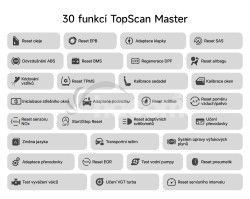 TOPDON TopScan Master ponúka prístup až k 30 pokročilým servisným funkciám údržby, vrátane resetu servisného intervalu, EPB, SAS, DPF, BMS, adaptácia škrtiacej klapky a ďalších funkcií podľa značky a modelu vozidla.