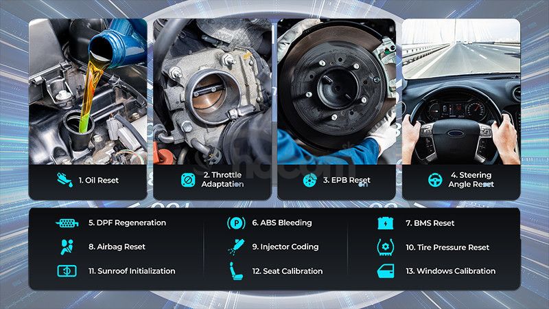 Všimli ste si kontrolky údržby? Nebojte sa - naša funkcia resetovania oleja vám kryje chrbát! TopScan Pre hrdo predstavuje komplexnú sadu 13 funkcií resetovania: Reset oleja, prispôsobenie plynu, reset EPB, reset uhla riadenia a ďalšie. . Diagnostikujte svoje vozidlo, vyriešte výstražné kontrolky.