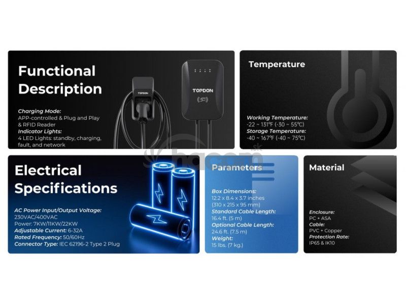 Táto nabíjačka je vybavená výkonným a spoľahlivým 22kW meničom, ktorý umožňuje nabíjať elektromobily takmer 10x rýchlejšie ako bežné zásuvky. Navyše je TOPDON PulseQ 22kW kompatibilný s väčšinou elektromobilov na trhu, vrátane značiek Tesla (potreba adaptéra), Audi, BMW, Volkswagen a ďalších. Vďaka týmto vlastnostiam je TOPDON PulseQ 22kW skvelou voľbou pre tých, ktorí chcú ľahko a pohodlne nabíjať svoj elektromobil v domácom prostredí.