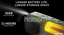 Model TS004 je poháňaný výkonnou batériou s kapacitou 5000 mAh, ktorá poskytuje viac ako 11 hodín prevádzky. So vstavaným 32GB úložiskom môžete ľahko ukladať zhotovené videá a fotografie.