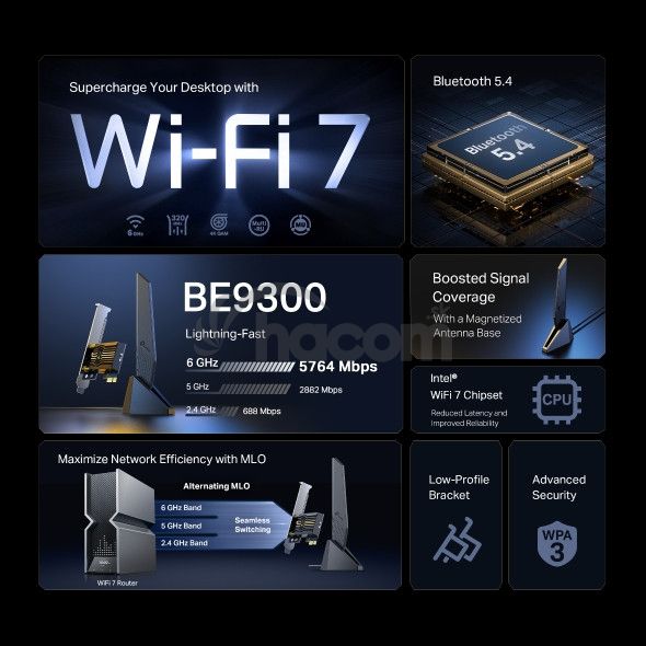 TP-Link Archer TBE553E – Wi-Fi 7 PCIe adaptérTento adaptér ponúka bezkonkurenčnú trojpásmovú rýchlosť až 5764 Mb/s (6 GHz), 2882 Mb/s (5 GHz) a 688 Mb/s (2,4 GHz) vďaka štandardu Wi-Fi 7.