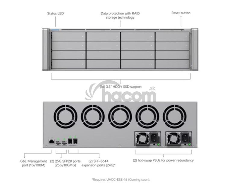Dva SFF-8644 porty umožňujú pripojenie rozširovacích jednotiek UACC-ESE-16 pre navýšenie kapacity až na 48 diskov celkom.