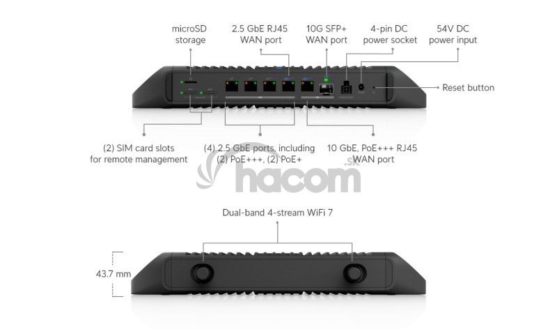 Kombinuje výkonný bezpečnostný gateway, integrovaný UniFi controller, NVR úložisko, pokročilé VPN funkcie, 10G konektivitu a vstavanú WiFi 7 do jedného kompaktného zariadenia.