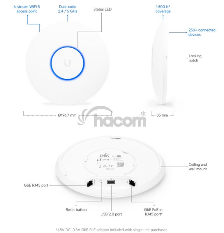 PŘEHLEDUbiquiti UniFi AC Pro je 802.11ac UAP zařízení. Jedná se o 3x3 MIMO 2,4GHz i 5GHz Acess Point s rychlostí přenosu až 1300+450 Mbps a podporou norem 802.11a/b/g/n/ac. UAP je určeno například pro kanceláře, hotely, sklady a díky voděodolnému provedení i venkovní prostory. Anténní systém obsahuje tři dualband 3 dBi antény s dosahem do vzdálenosti až 122 metrů. Plně podporuje také roaming při předávání asociovaných klientů mezi jednotlivými AP. Obsahuje 2x Gigabit LAN s 48V (44 až 57V) napájením přes PoE (pasivní i aktivní 802.3af/802.3at) a jedním portem USB 2.0.