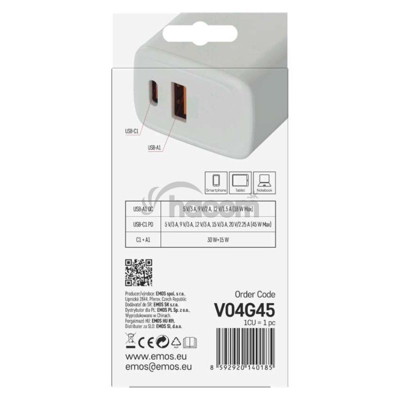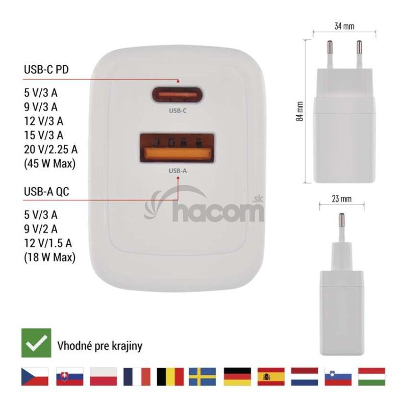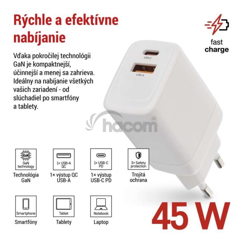 - Univerzálny USB adaptér GaN do siete PD 45 W max. V04G45