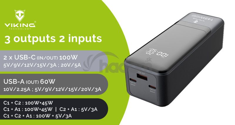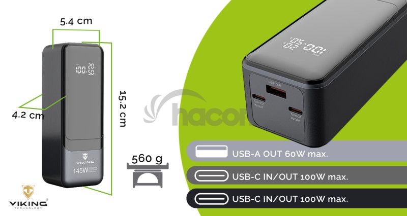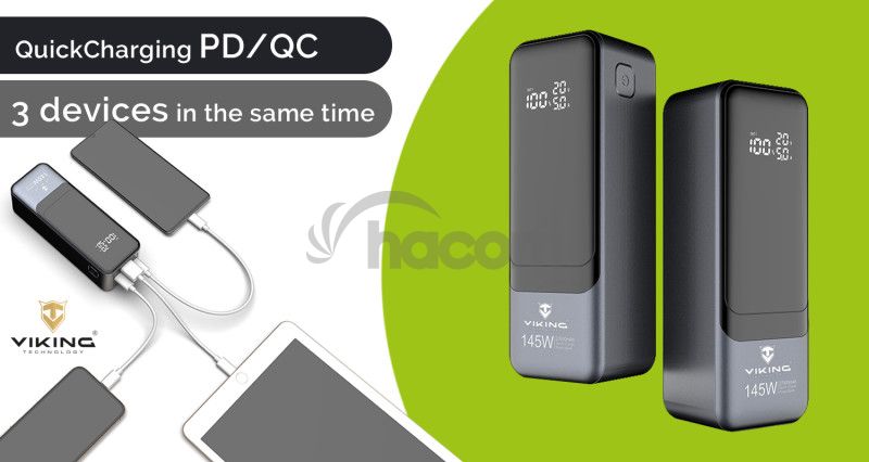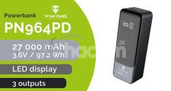 Kapacita 27000mAh (97.2Wh) • podpora rýchlonabíjania QC a PD • 2 x USB-C vstup/výstup až PD100W max • USB-A výstup QC60W max. • LED displej • MCU inteligentné zdieľanie výkonuViking PN-964PD 27000 mAh