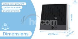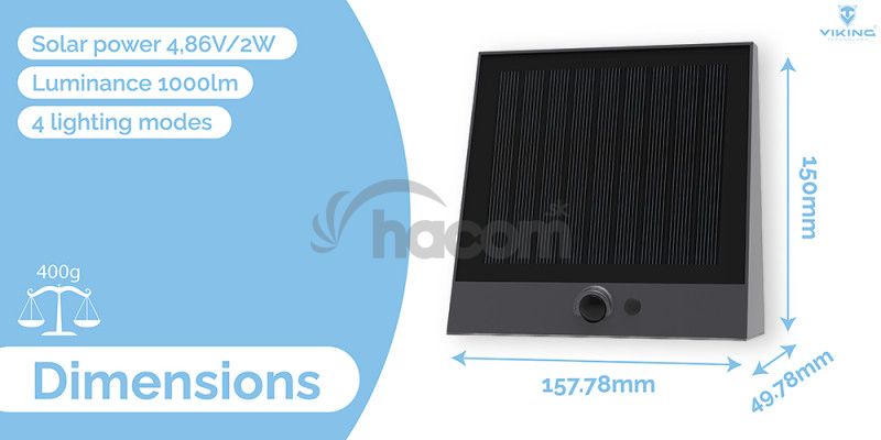 Svietivosť 1000 lm • solárne napájanie • farba svetla 4000K (denná biela) • 4 režimy osvetlenia • doba osvetlenia za nevhodných podmienok viac ako 10 dní • odolnosť IP54 • kapacita batérie 3,7V/7,4Wh • výkon solárneho panelu 4,86V/2WVonkajšie solárne LED svetlo s pohybovým senzorom Viking SR25